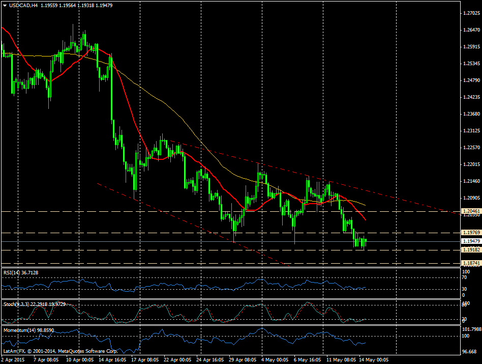 USDCAD (4H) En el muy corto plazo el USD/CAD se está moviendo en sentido lateral entre 1.1970 y 1.1925. La salida de este rango debería de marcar la tendencia para las próximas horas. Los indicadores técnicos en cuatro horas están dando señales a favor del dólar.
