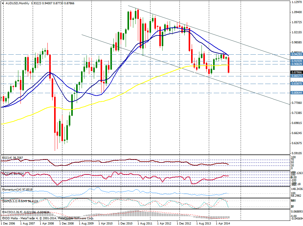 El gráfico de mes muestra la magnitud de la caída del AUD/USD de los últimos días. Las señales siguen favoreciendo el escenario bajista en el largo plazo.