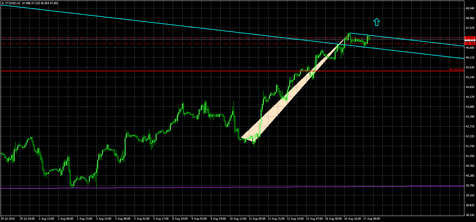 - El West Texas (XTI/USD) cotiza en estos momentos cerca de la zona de 47 dólares el barril dentro de un canal bajista, o posible bandera. Este patrón indica alta probabilidad de continaución de la tendencia mayor alcista en caso de quiebre del margen superior.