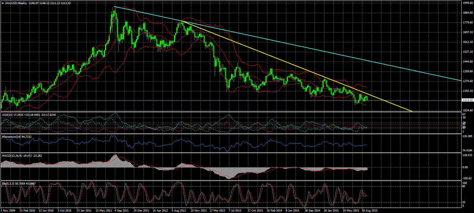 - El Oro concluye Septiembre manteniendo la tendencia bajista, y prolongando el recorrido iniciado a mediados de 2011, desde donde se traza la línea directriz (color celeste).