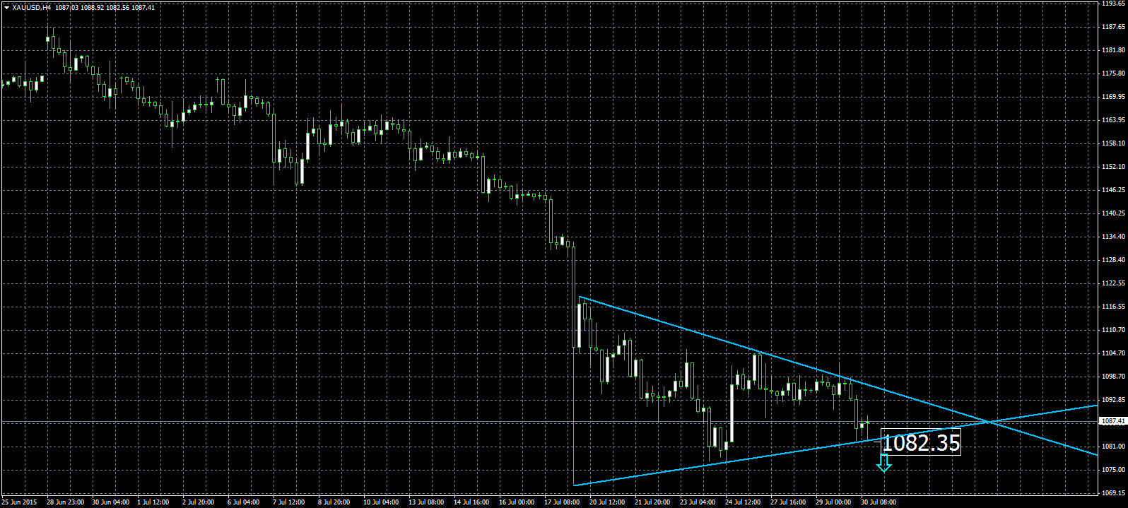 - En gráficos de 4 horas visualizamos la formación de un patrón denominado Triángulo Simétrico, con idas y vueltas dentro de la figura, que de confirmar el quiebre del margen inferior en 1080, incrementaría la velocidad bajista.
