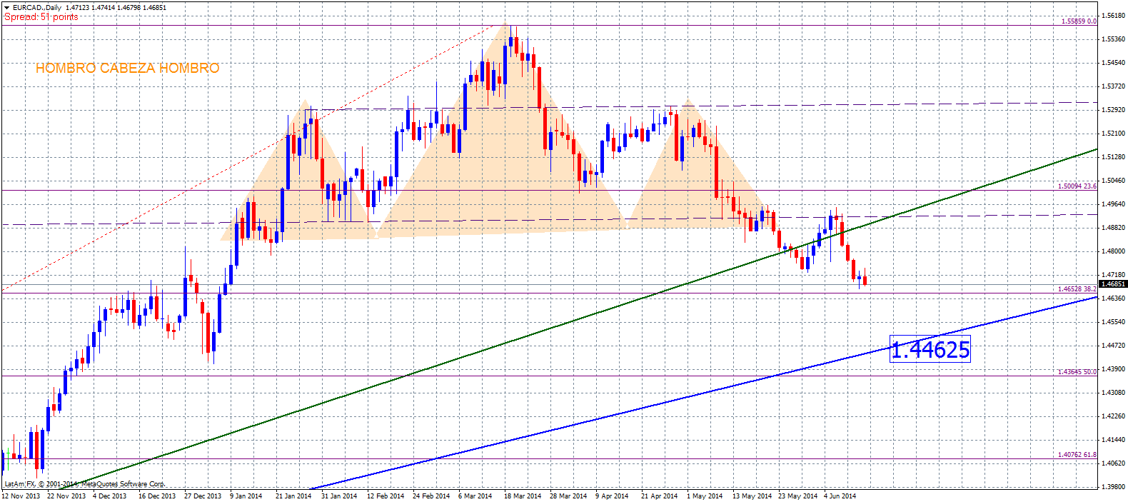 Desde el nivel de precio actual, ubicamos como próximo nivel de parada a 1,4660, y luego 1,4610. Siendo el objetivo final del movimiento la zona de 1,4460 donde ubicamos la línea de tendencia alcista en semana.