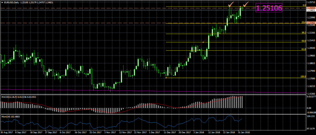 - Viendo el gráfico en día en este primer viernes de Febrero, la paridad ha tocado por segunda vez la zona de 1,2510, el cual ha respetado retrocediendo su precio. Este segundo intento fallido brinda argumentos necesarios, pero no suficientes para adelantar una posible caída a través de un Doble Techo.