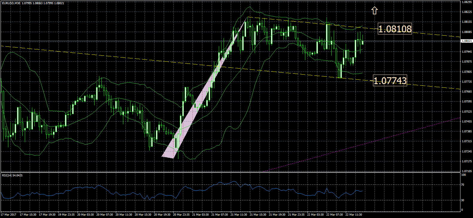 • El quiebre de la zona donde pasa en estos momentos el margen de la figura mencionada confirmaría el patrón, y desencadenaría un recorrido similar a la altura del mástil de la formación, en este caso  se trataría de unos 90 pips cuyo objetivo probable se encuentra en 1,0900. Previamente en 1,0850 se encuentra la zona de resistencia intermedia.