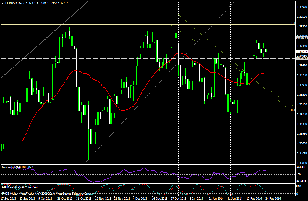 El EUR/USD continúa operando en rangos, tal como había cerrado la semana pasada, por debajo de 1,3770 y sobre 1,3690. Una confirmación por fuerte de este rango con un cierre diario, daría señales de continuación en los recorridos.