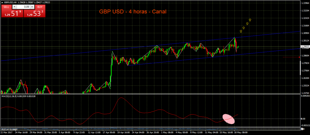Luego del pull back entró en una tendencia alcista que lleva 10 semanas, presentándose, en la últimas 4 semanas, en una congestión enmarcada en un canal (gráfico de 4 horas), esperando mantener la tendencia alcista precedente y que rompa el canal al alza, también apoyada por la línea del MACD, que rompió el nivel de cero hacia arriba, y así poder encaminarse, para acercase al objetivo teórico de la figura de HCH invertido. De no prosperar y que el precio rompa el canal a la baja, encontraremos su primer soporte cerca de 1.2700.