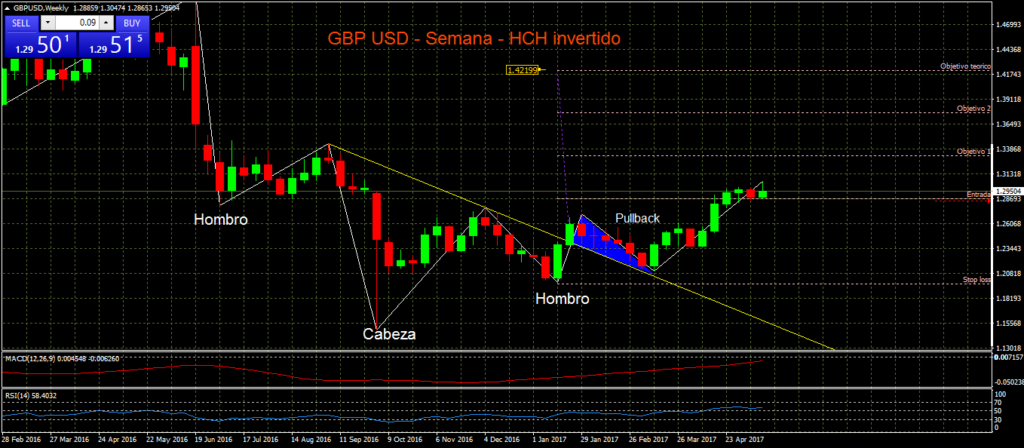 Analizando el grafico semanal, nos encontramos con una figura de Hombro-cabeza-hombro invertido, con su correspondiente pull back (triángulo azul), teniendo como objetivo teórico la zona de 1.42200.