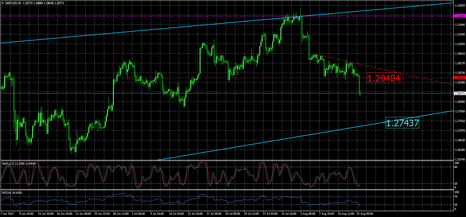 - El par GBP/USD encontró razón para caer, y ceder más de 130 pips hasta la zona de 1,2880 donde cotiza en estos momentos. Analizando gráficos en 4 horas, se puede visualizar un triángulo descendente, el quiebre de su margen inferior o soporte en 1,2950, y aceleración del recorrido tras la superación de la zona de equilibrio que detenía el movimiento.