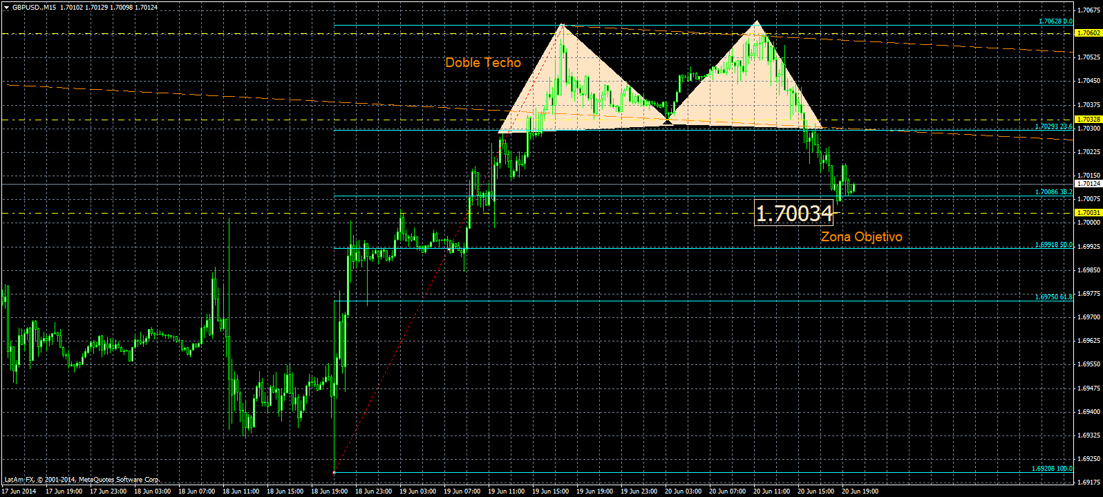 Como hacíamos mención en el informe de hoy durante la mañana americana (Ver informe AQUI), la Libra Esterlina retrocedía luego de conformar un Doble Techo en la zona de resistencia cercana a 1,7055/60.