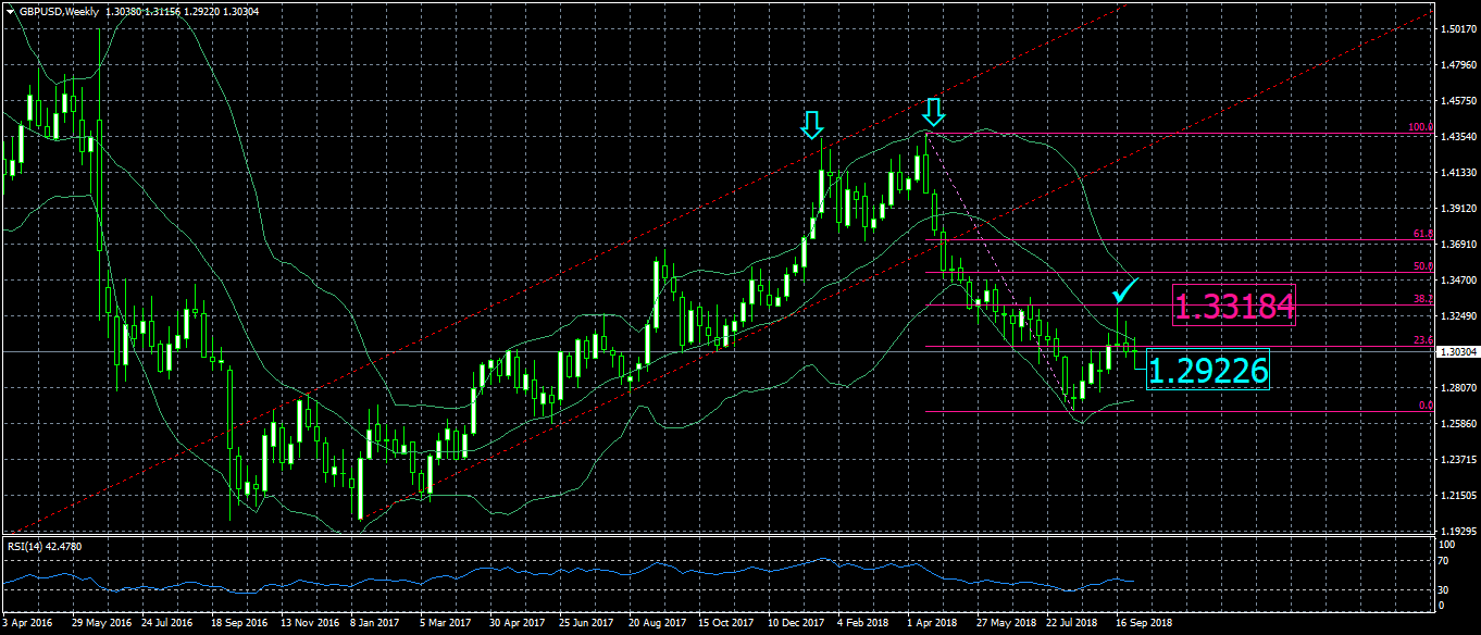 • La tendencia semanal se mantiene en dirección bajista, y a pesar de la recuperación del pasado mes de Septiembre, el «cable» no pudo superar el nivel de resistencia en 1,3320/30 donde se ubica el 38,2% de Fibonacci, desde donde retoma la tendencia mayor.