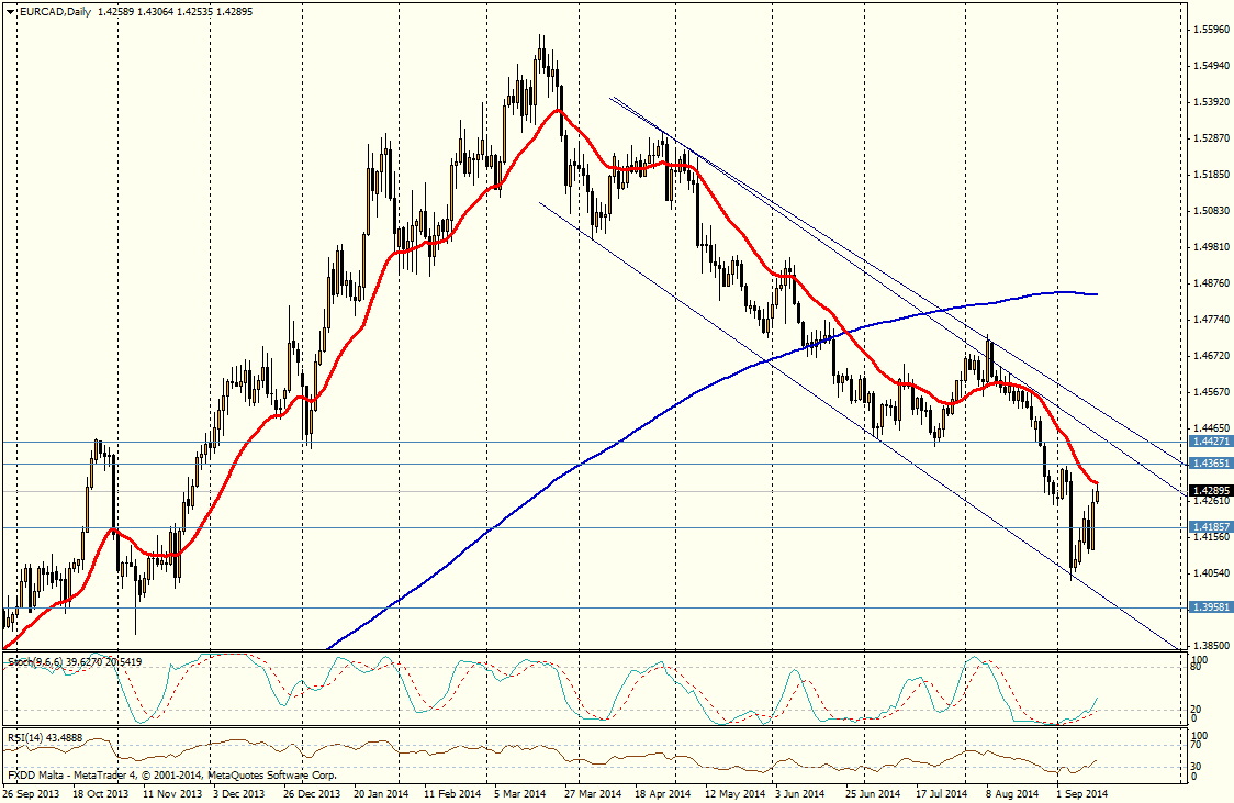 Recuperación del euro, junto con la caída del dólar canadiense hicieron que se produzca una brusca suba en el EUR/CAD, que trajo al precio hacia la media móvil de 20 (línea roja).