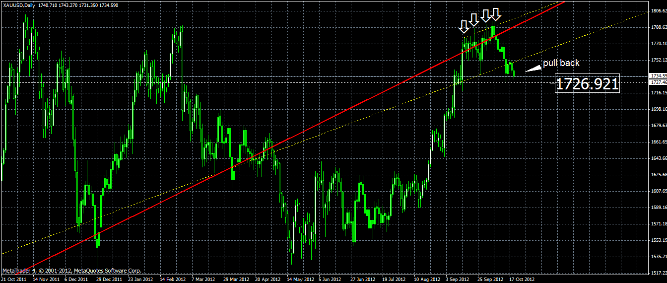 Días atrás hicimos mención en nuestro informe (Ver aquí), que el Oro se enfrentaba a una importante zona de resistencia en el rango de precios donde encontramos la línea de tendencia semanal alcista quebrada, la cual había guíado el movimiento del año 2011 hasta los máximos históricos del metal en la zona de 1900 dólares la onza.