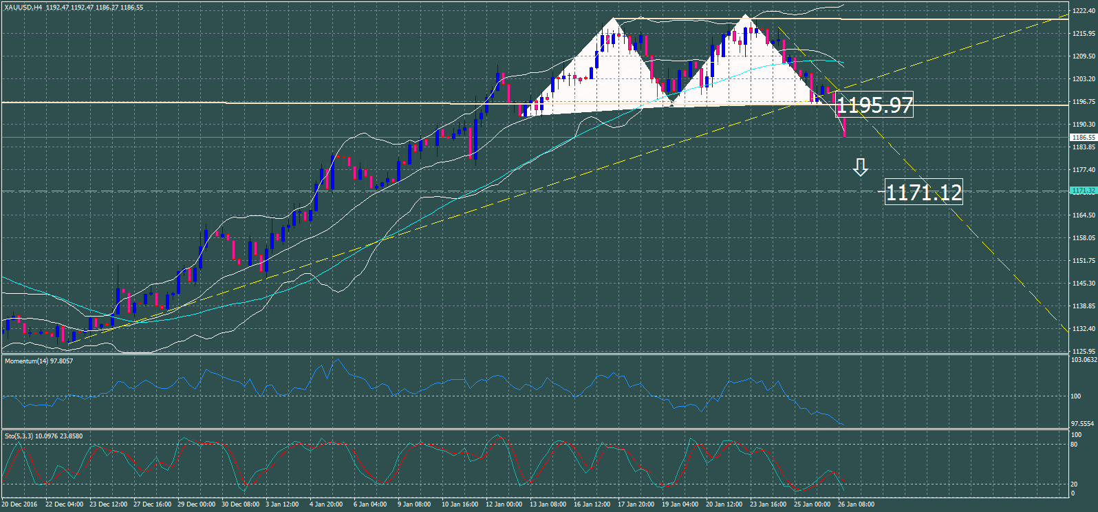 Acorde a lo publicado ayer (Ver informe), el Oro quiebra la zona de neck line y confirma el Doble Techo extendiendo el recorrido bajista en este nuevo día jueves. Supera la zona de 1195 dólares la onza, y encuentra nivel de detención provisorio en 1187/88 en estos momentos.