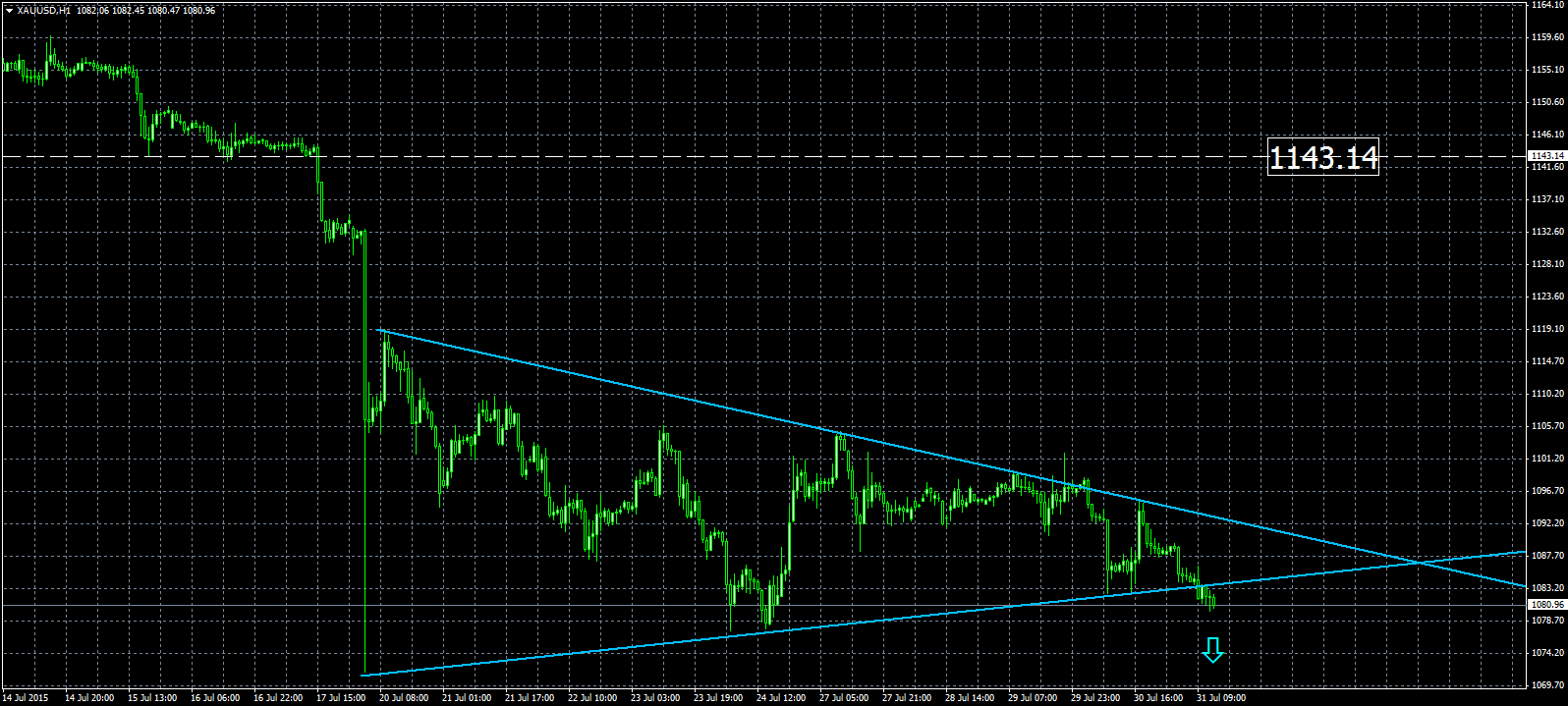 - En este día viernes podemos apreciar un nuevo movimiento bajista de la divisa dorada, superando el margen inferior del triángulo simétrico (Ver análisis AQUI), que conforma en gráficos horarios, y cotizando apenas por encima de la zona de soporte en 1080 dólares la onza.