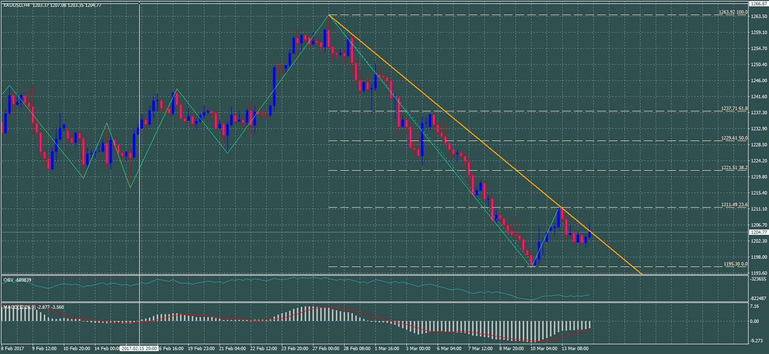 • Luego de formar un mínimo en 1195, el metal dorado recuperó posiciones hasta la zona del 23,6% de Fiboncci en 1211, desde donde retoma la tendencia bajista imperante.