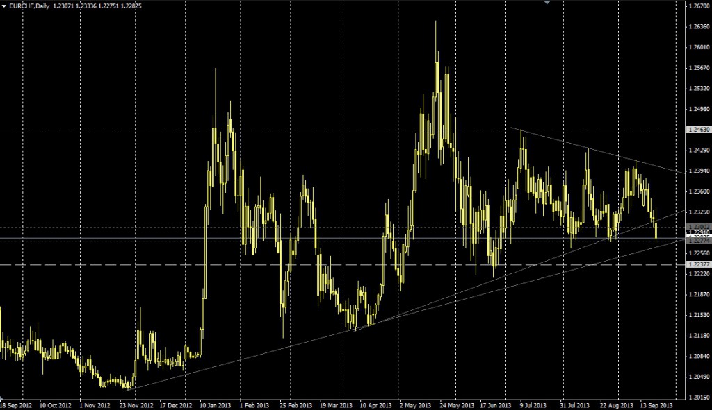 El EUR/CHF cayó por debajo de 1,2300 y descendió rápidamente a probar otro soporte importante localizado en torno a 1,2270/75, que es donde se ubican los mínimos de julio y agosto. Además por allí está cruzando una línea alcista que tiene origen en noviembre del 2012. De caer por debajo de 1,2270 y consolidarse se […]