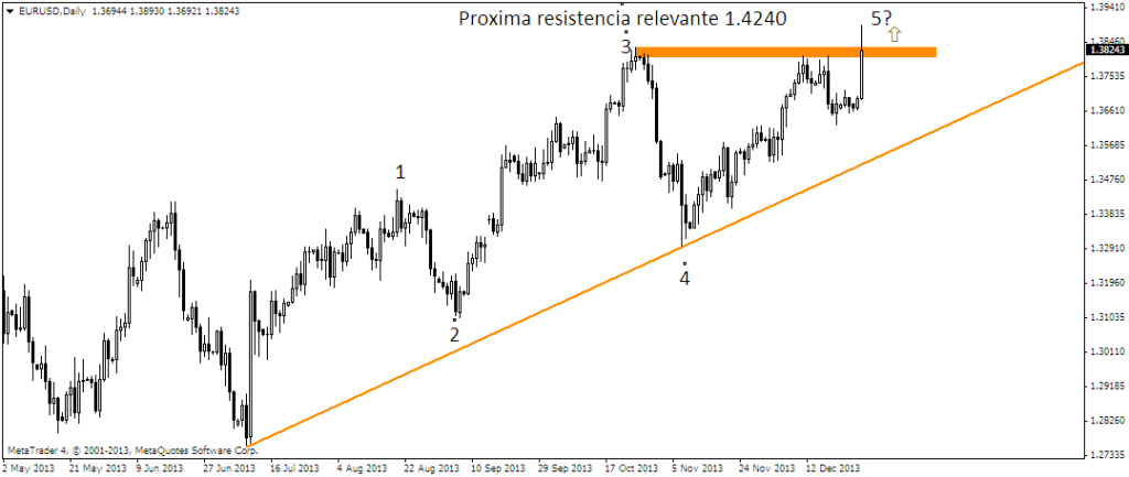 Por Hernán Uran, de SofmarFX El euro termina el año como lo comenzó, alcista. Un 2013 con idas y vueltas para la moneda única, donde 1.2750 ha servido como soporte en varios intentos, y desde allí comenzó un camino alcista que lo encuentra hoy viernes 27 de diciembre marcando un nuevo máximo anual en […]