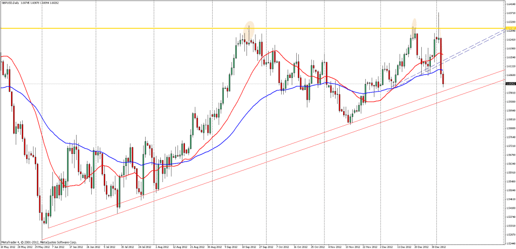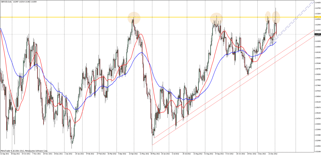 La caída del dólar llevó al GBP/USD a trepar con fuerza y superar claramente 1,6300 por primera vez desde agosto de 2011. La clave ahora pasará por ver si se logra consolidar por encima. El retroceso del GBP/USD desde 1,6300 durante la segunda mitad de diciembre de 2012 encontró soporte en la medía móvil diaria […]