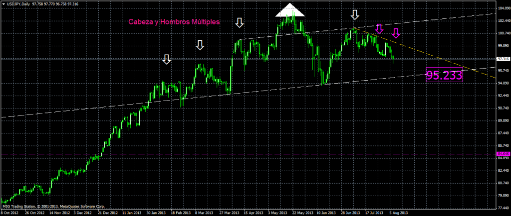 Como venimos haciendo mención hace semanas (Ver informe AQUI), el par USD/JPY extiende la conformación de un posible patrón de cambio direccional en semana denominado Cabeza y hombros múltiples. El mismo tiene su zona de neck line, o cuello, en el nivel de precios cercano a 95,20. Yendo al día de hoy, el par cotiza […]