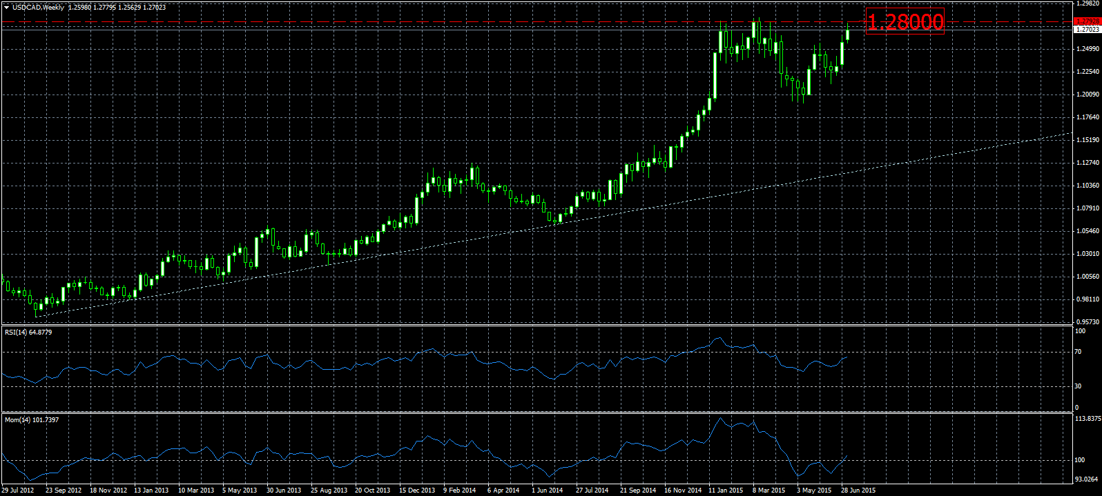 - El dólar canadiense no detiene su recorrido bajista ante la divisa americana. El movimiento que comienza en Septiembre de 2012, y se visualiza a partir del trazado de la línea directriz con la formación de mínimos ascendentes, incrementa la velocidad en estos últimos días alcanzando la fuerte zona de resistencia en 1,2800.