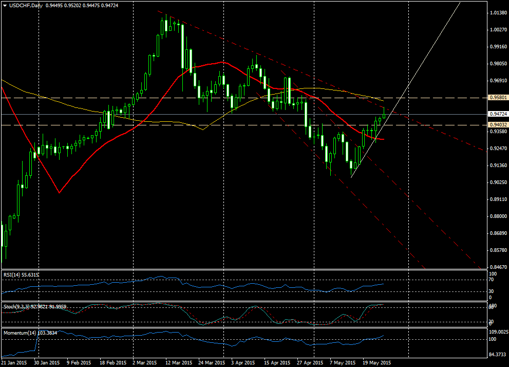 - La apreciación del dólar hace que el USD/CHF esté subiendo por tercera jornada en forma consecutiva. El rally ha subido a probar la línea de tendencia bajista originada en los máximos de marzo.