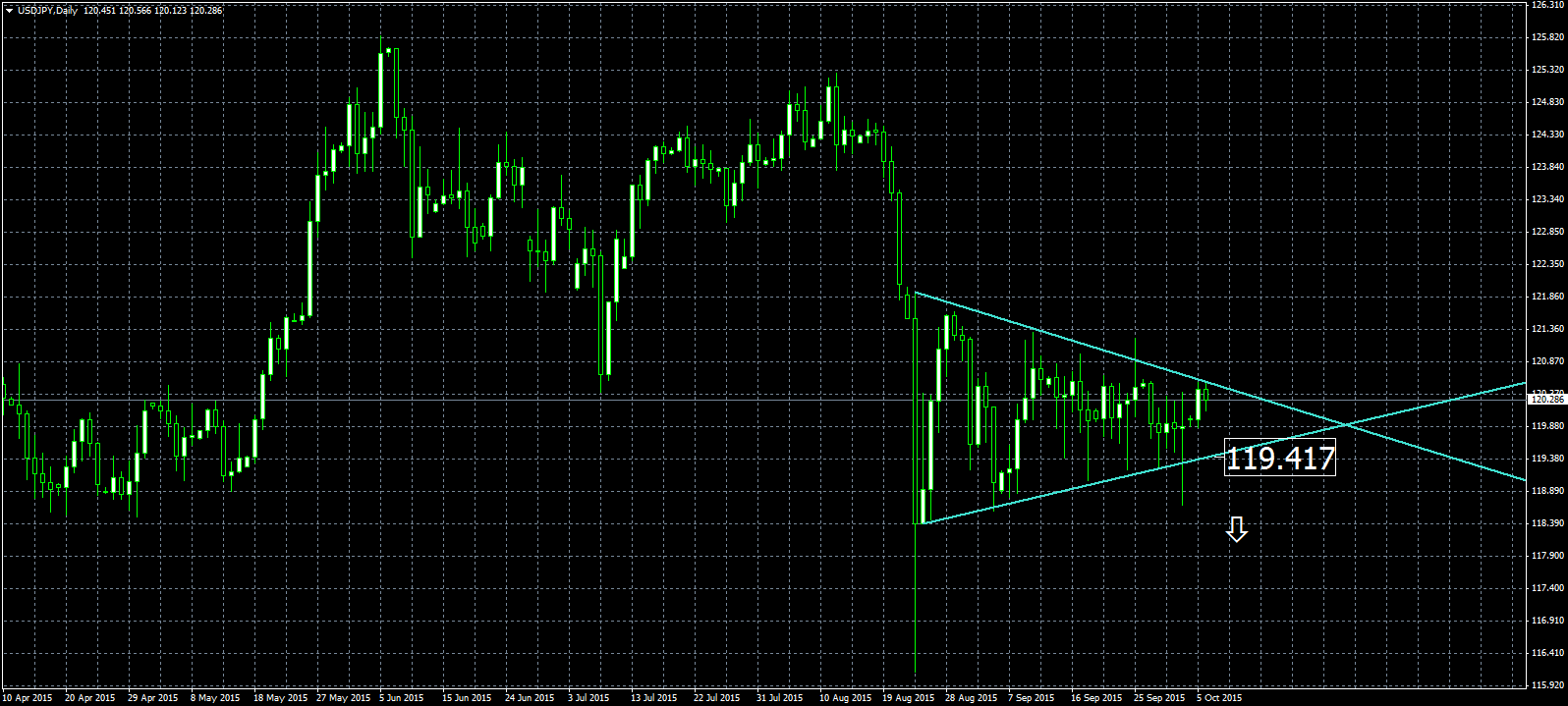- Entre máximos descendentes, y mínimos ascendentes se puede trazar los margenes que contienen la figura. El Análisis Técnico ubica a este tipo de patrónes, como figuras con incidencias de continuación del movimiento direccional. Dicho esto, las probabilidades asociadas implicarían un posible movimiento bajista mayor tras el quiebre de la zona de 119,40.