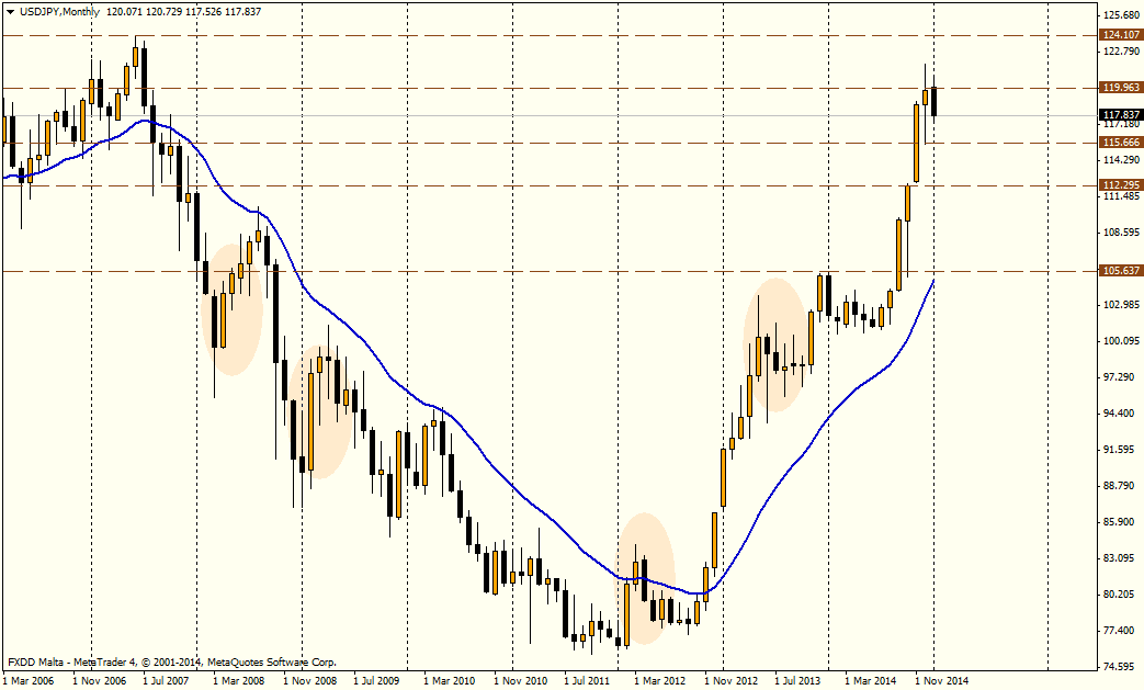 También puede servir de referencia lo que pasó sobre el cierre del 2013, cuando el USD/JPY durante dos meses, y luego cayó en enero. Esto fue seguido por otro mes, con pérdidas marginales y una consolidación posterior por varios meses.